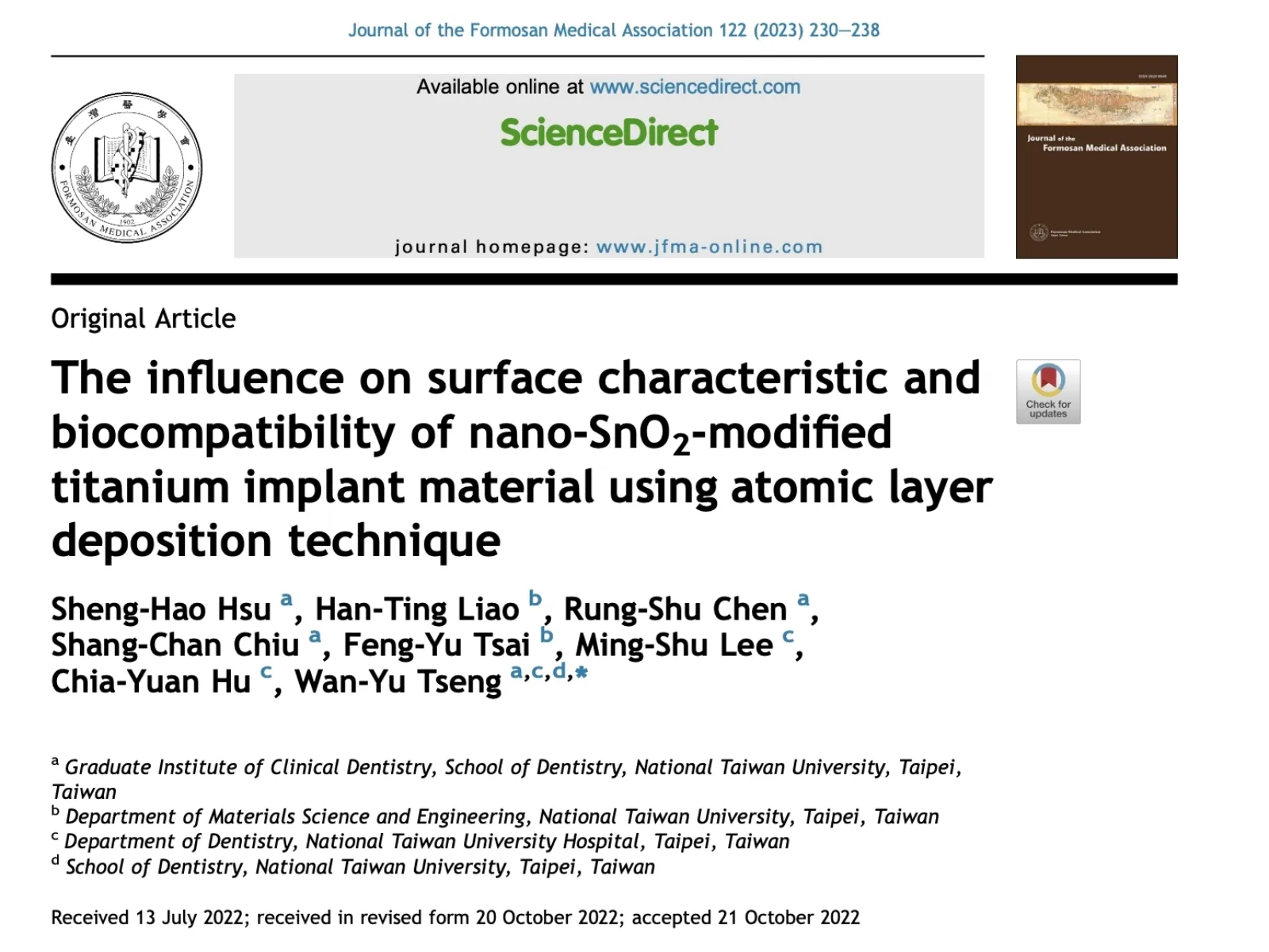 《Journal of the Formosan Medical Association》| The influence on surface characteristic and biocompatibility of nano-SnO2-modified titanium implant material using atomic layer deposition technique