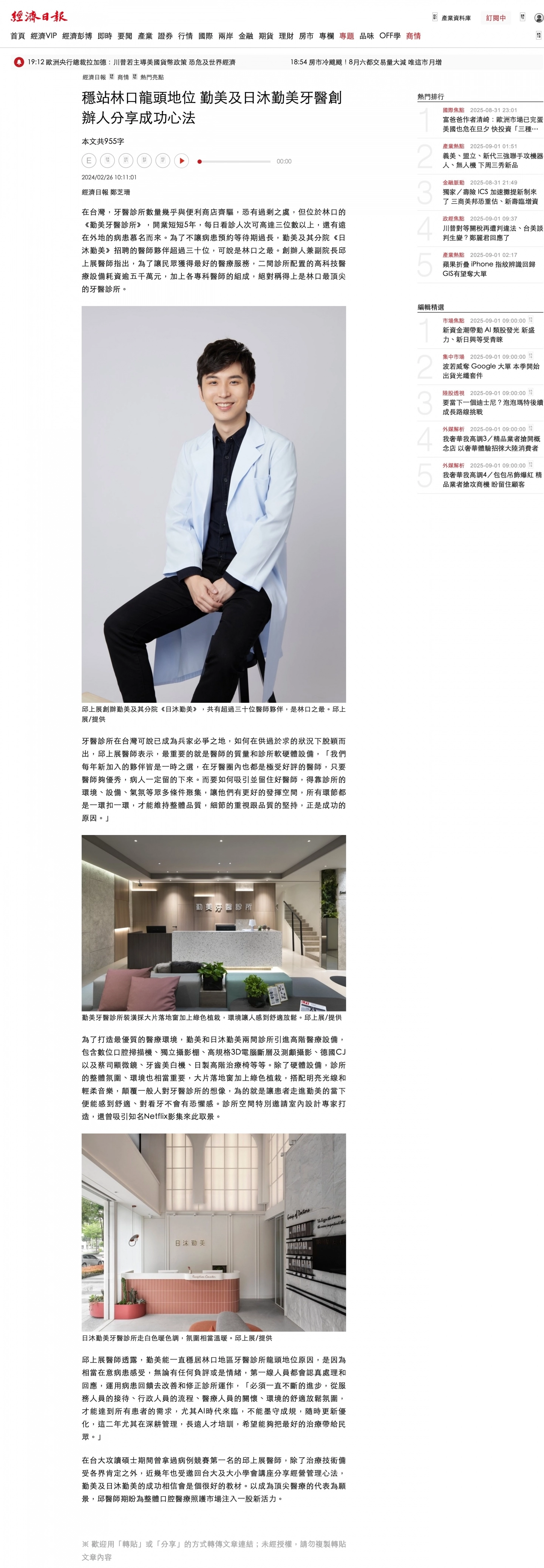 在台灣,牙醫診所數量幾乎與便利商店齊驅,恐有過剩之虞,但位於林口的《勤美牙醫診所》,開業短短5年,每日看診人次可高達三位數以上,還有遠在外地的病患慕名而來。為了不讓病患預約等待期過長,勤美及其分院《日沐勤美》招聘的醫師夥伴超過三十位,可說是林口之最。創辦人兼副院長邱上展醫師指出,為了讓民眾獲得最好的醫療服務,二間診所配置的高科技醫療設備耗資逾五千萬元,加上各專科醫師的組成,絕對稱得上是林口最頂尖的牙醫診所。