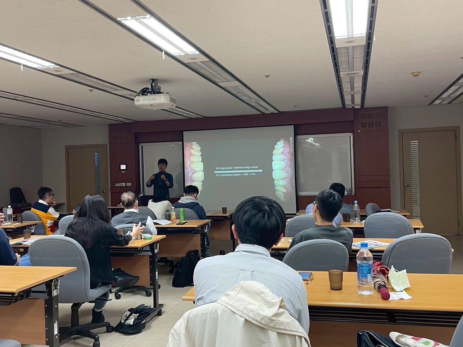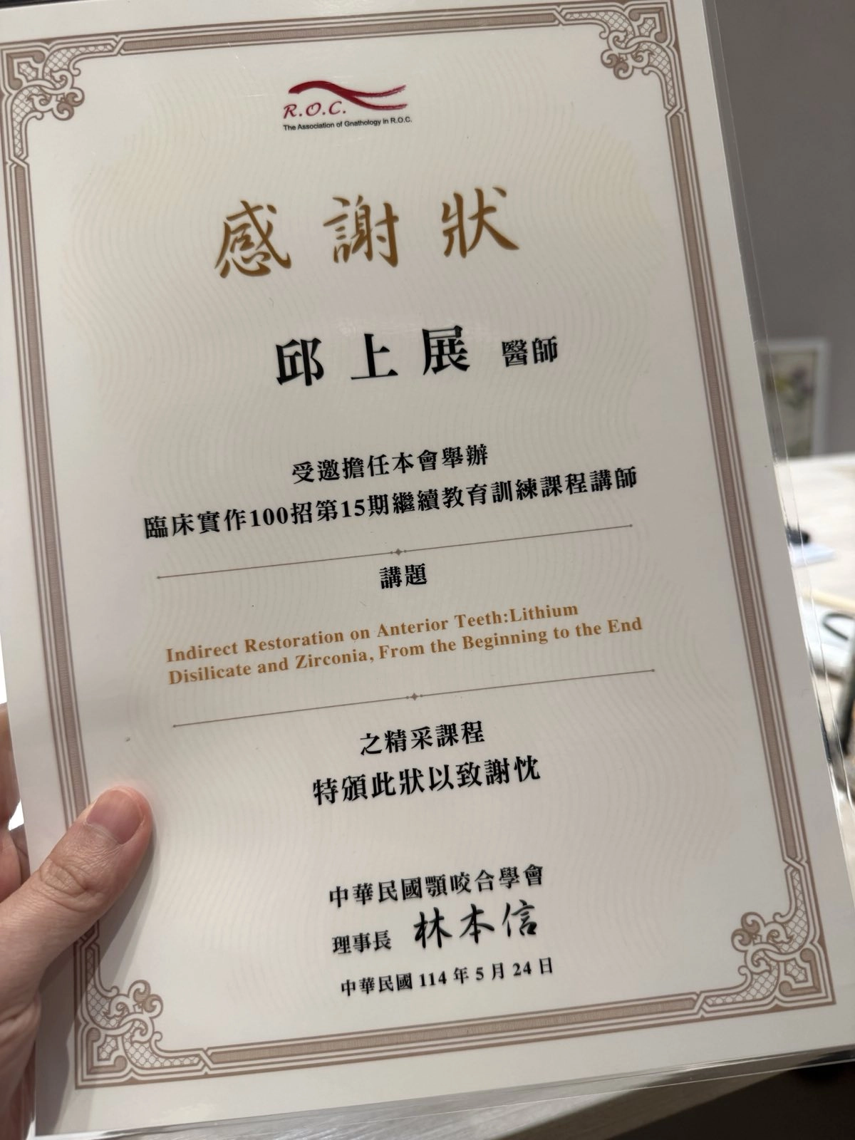 受邀擔任中華民國顎咬合學會的專題講師,分享「美學貼片」的臨床操作與應用。以「理論 × 實務 × 經驗」為核心,為了讓內容更紮實,我花了大量時間閱讀學術論文與實驗記錄,製作超過百頁的簡報,只為將這些年在美學貼片上的理論及臨床經驗,清楚傳遞給現場的醫師們。
