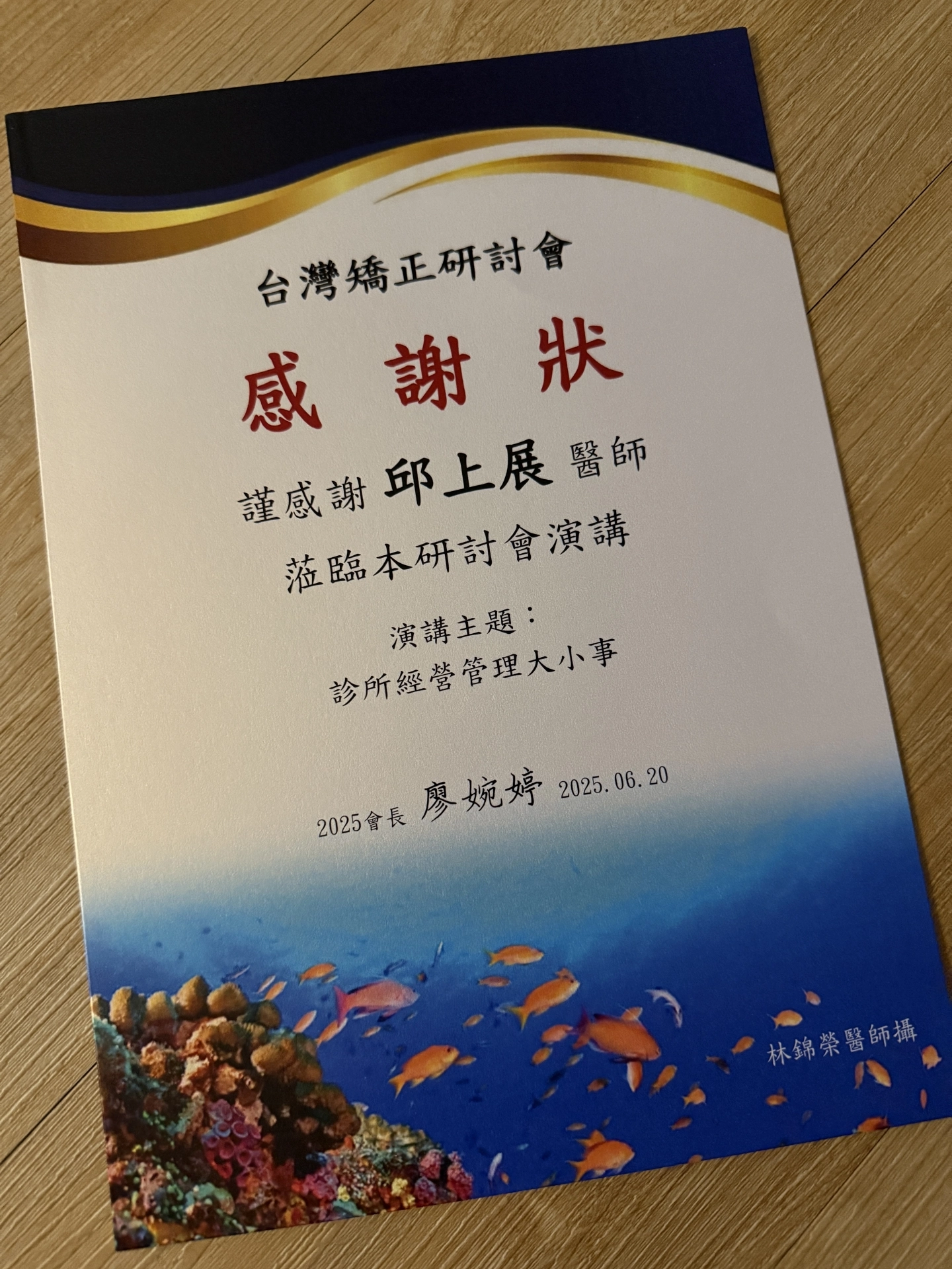 很榮幸受邀參與台灣矯正研討會舉辦的〈新型態診所經營管理課程〉,以讀書會形式與許多業界的矯正專科前輩們,分享自己對於診所經營管理的觀念和實務經驗。我的分享主題聚焦於「打造診所及經營管理」:從選址、空間規劃、股東機制設計,到團隊組織建立、助理管理制度等,如何讓診所從單一場域變成一個有溫度、有制度、有願景的醫療品牌。